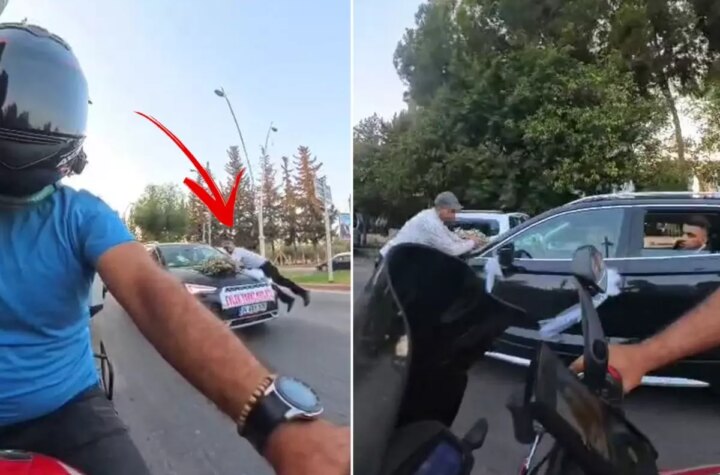 Adana'da düğün konvoyunu gören bir kişi, para alabilmek için koşup otomobilin kaputuna atladı. Şahıs...